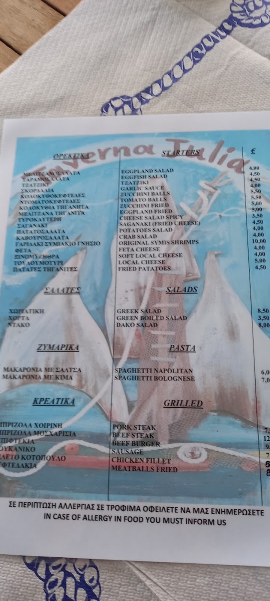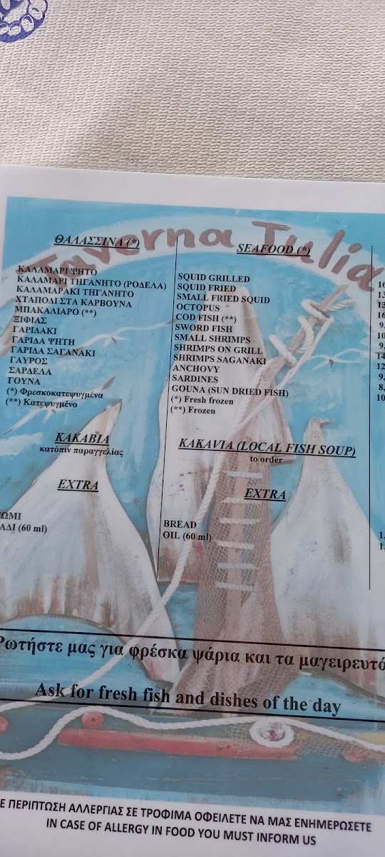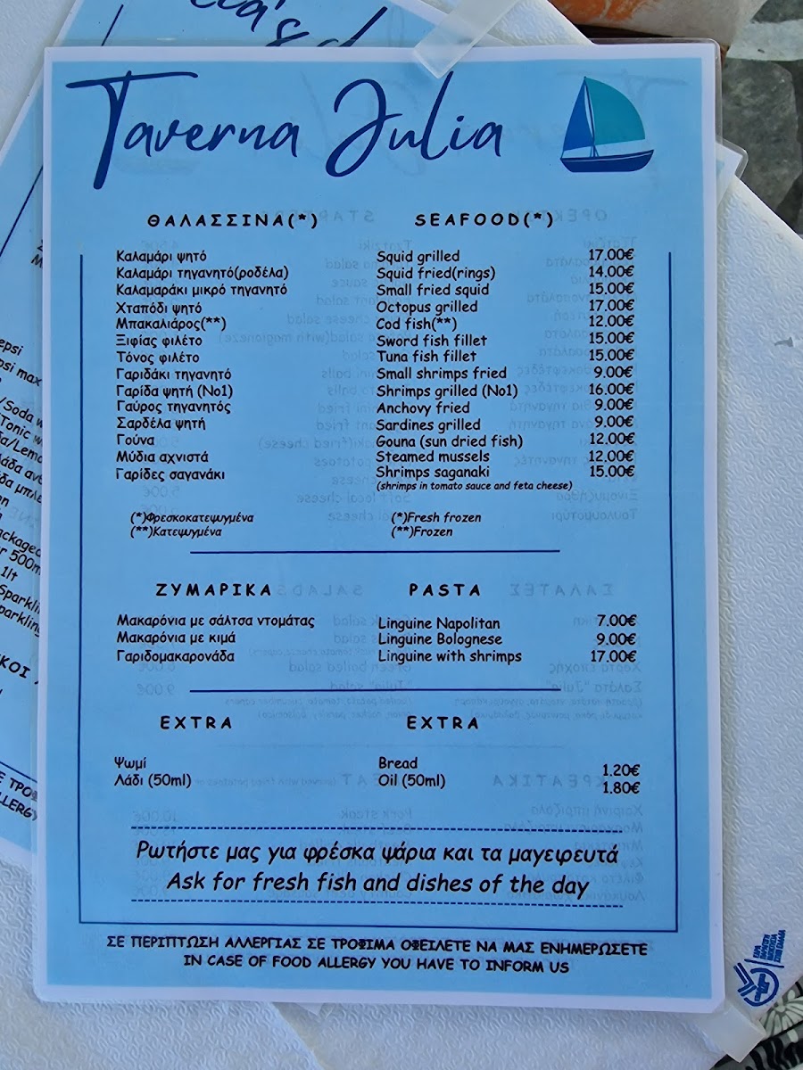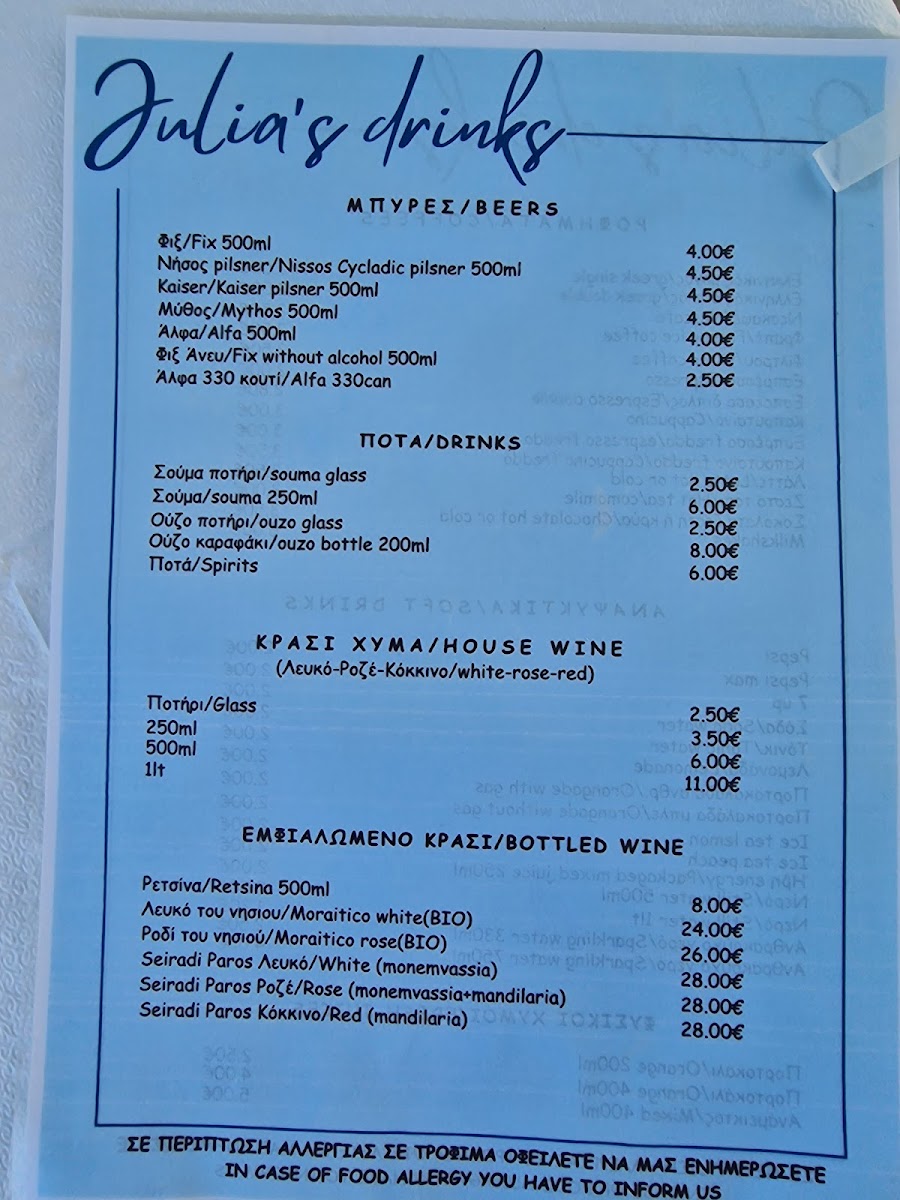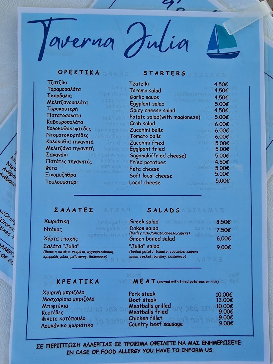 The menu at Taverna Julia offers a taste of traditional Greek island cuisine with a relaxed, seaside tavern style. You’ll find a well-curated selection of simple, fresh dishes that pair beautifully with the tranquil ocean views and unhurried atmosphere.